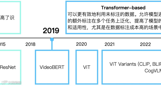 到了 2019 年,随着 Transformer 结构的诞生及其在自然语言处理中的成功应用,预训练 Transformer 架构模型如 VideoBERT 开始兴起。