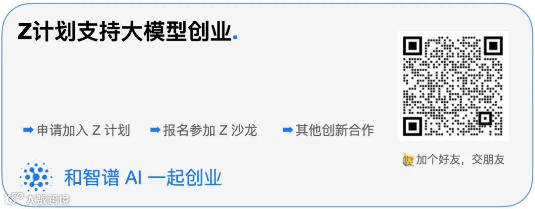 「Z计划」 是智谱 AI 面向未上市初创企业与优秀独立开发者/团队,提供 Tokens 赞助、投资支持和技术支持等资源的创新加速计划。面向全球,持续招募中!🐋(点击报名)