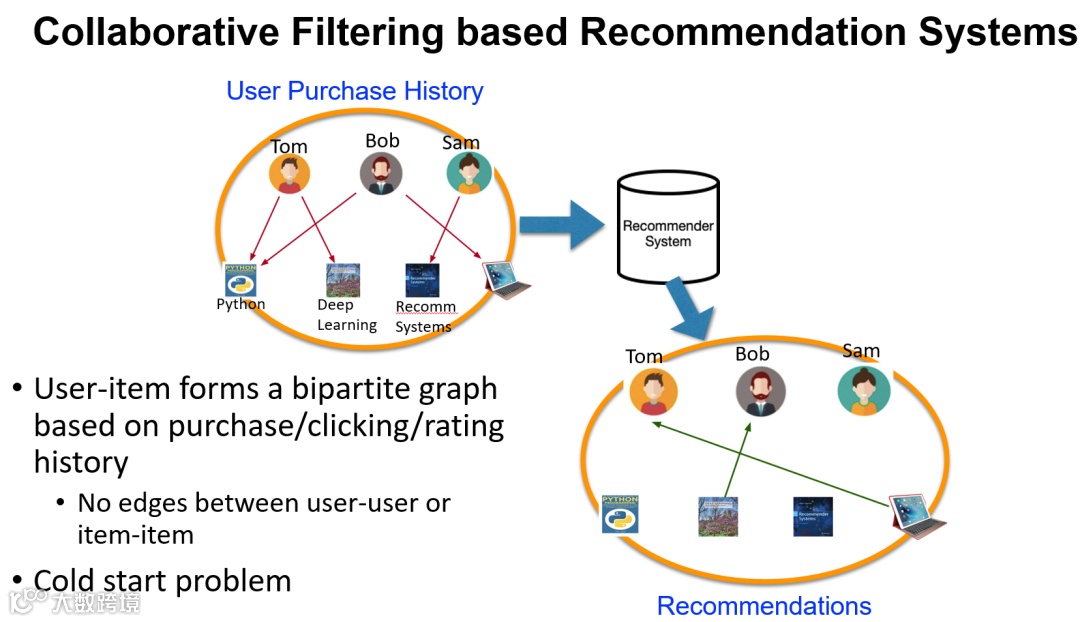 例如,我们可以把协同过滤(Collaboration Filter)表示成一个二分图,其中包括用户和物品。如果用户购买或喜欢某个物品,我们就在图中建立连接(edge)。