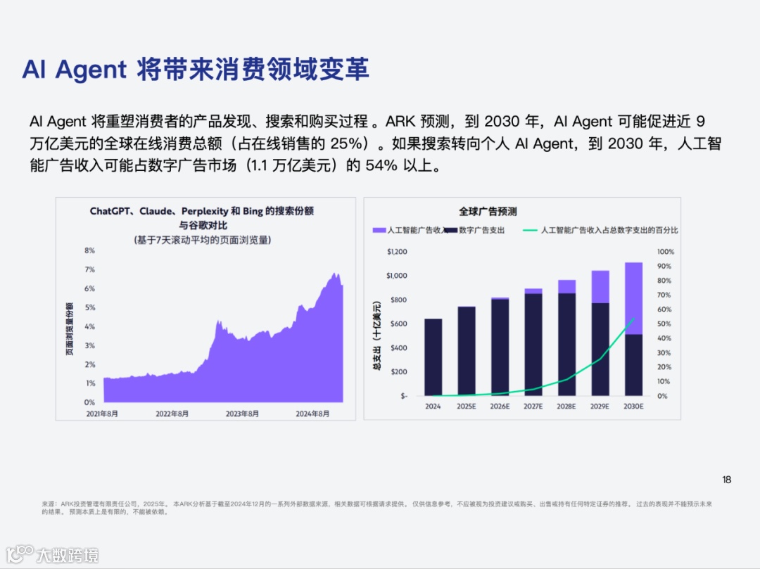 a. 展望了 AI Agent 对消费领域的变革,即 AI 购物代理将简化消费者发现、搜索及购买商品的过程,推动在线消费、AI 广告收入增长。消费体验从“一键结账”到“一次查询购买”,AI 购物代理驱动的数字钱包将有望向产业链上游发展,同时继续抢占其他支付方式的市场份额。