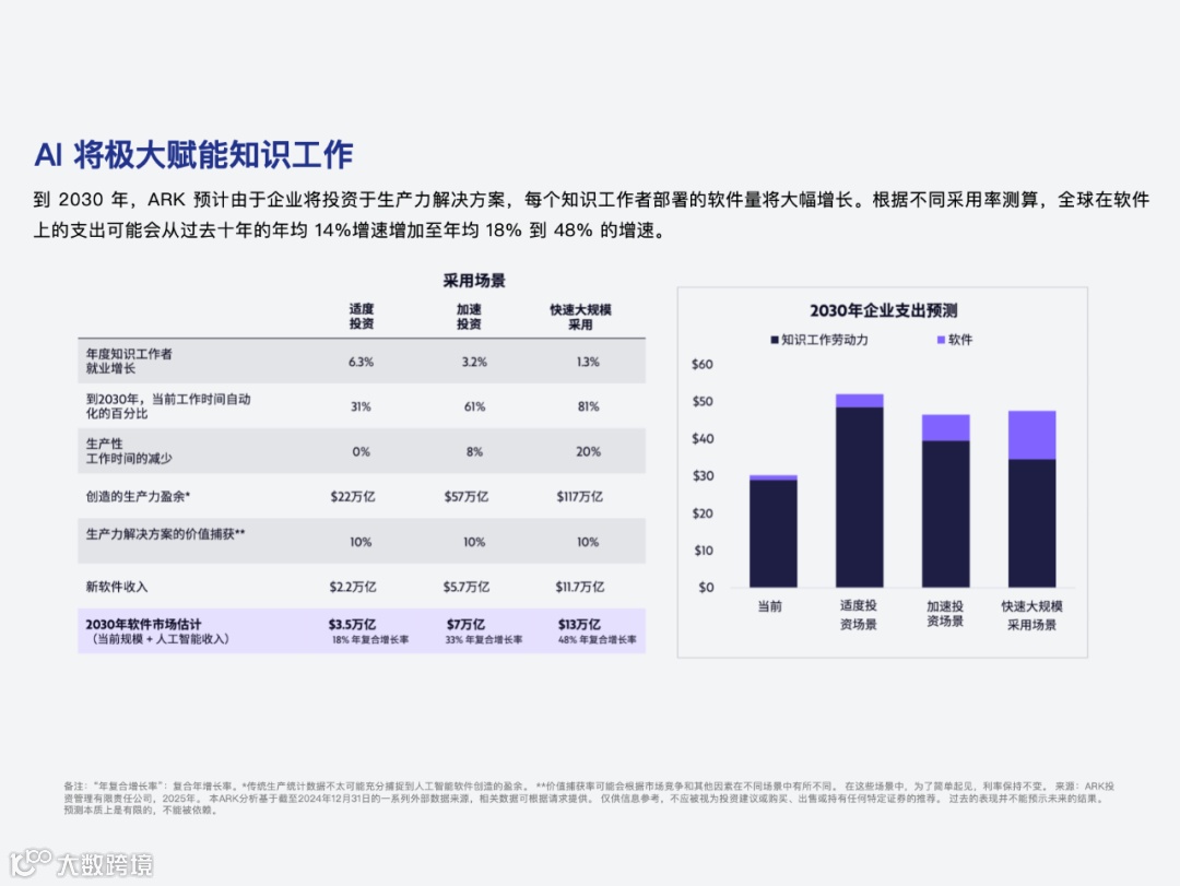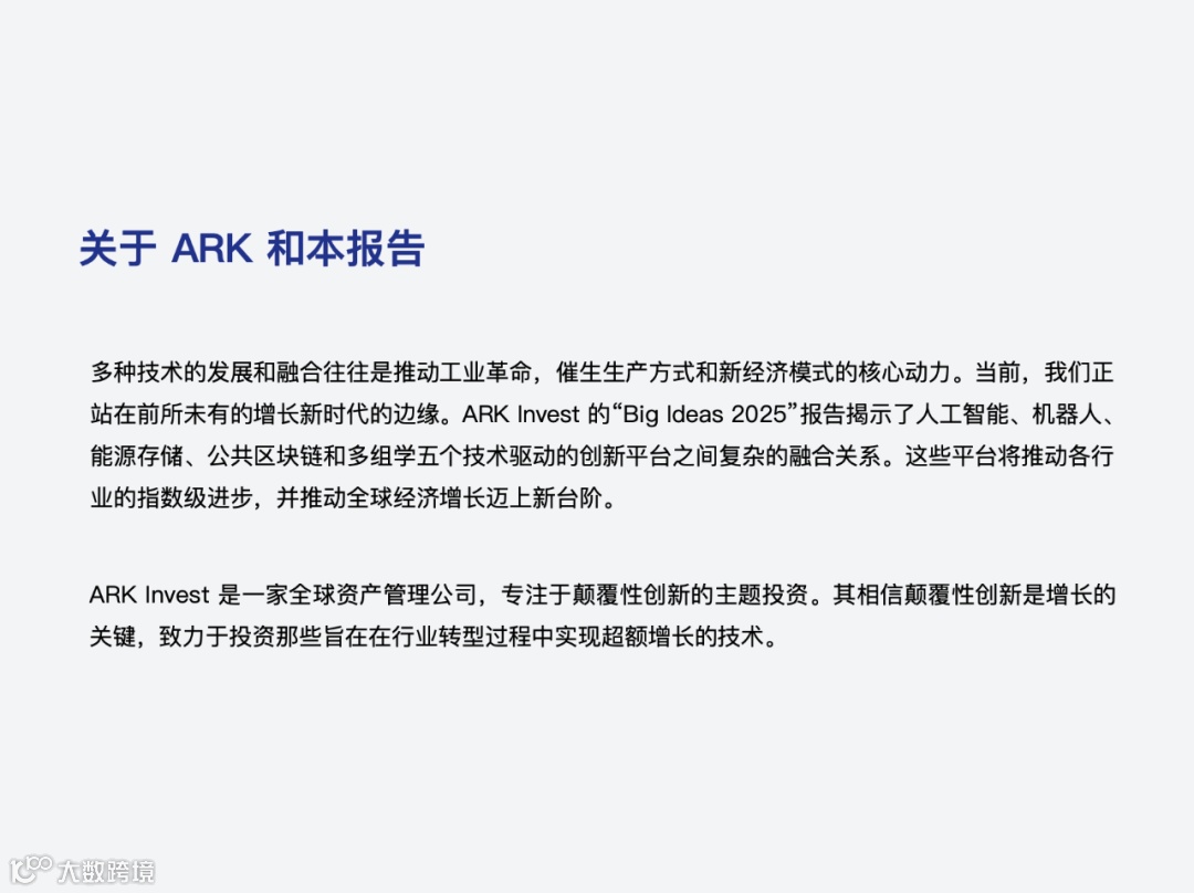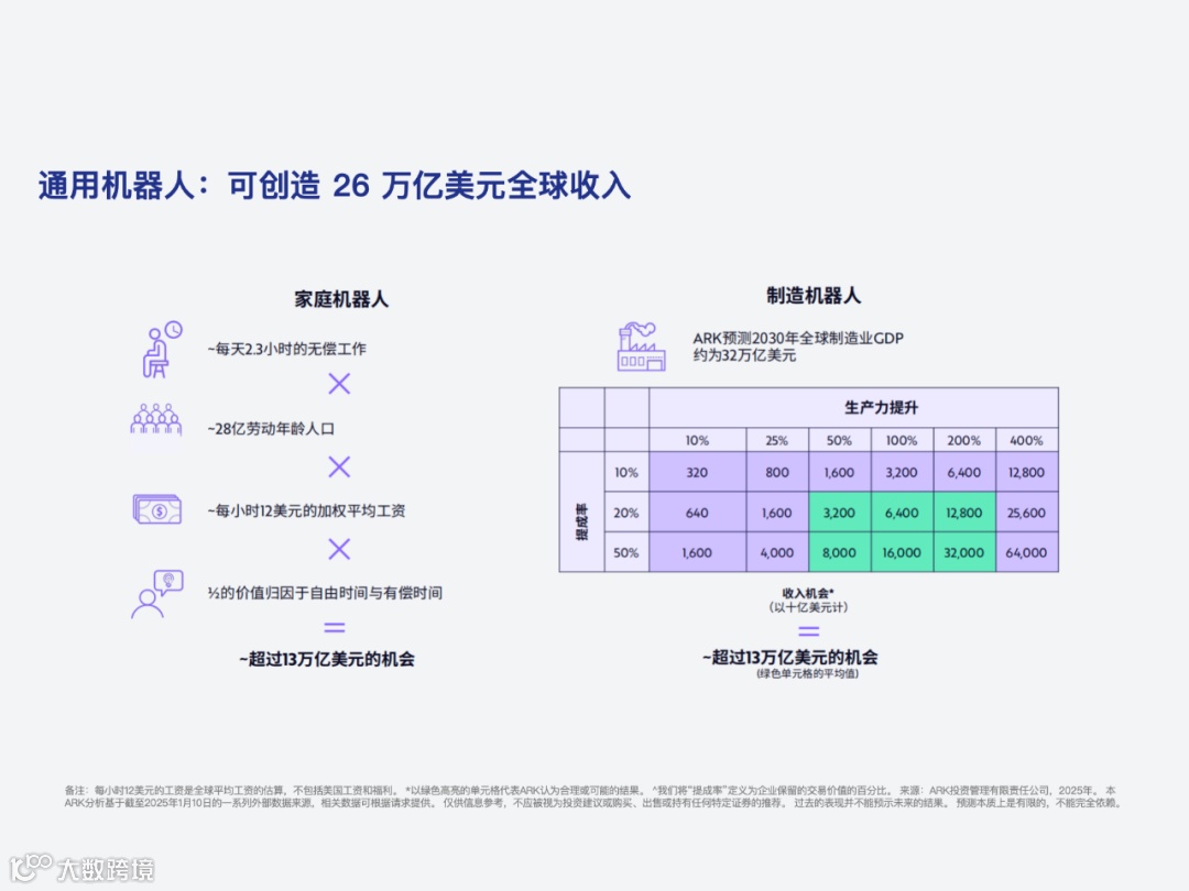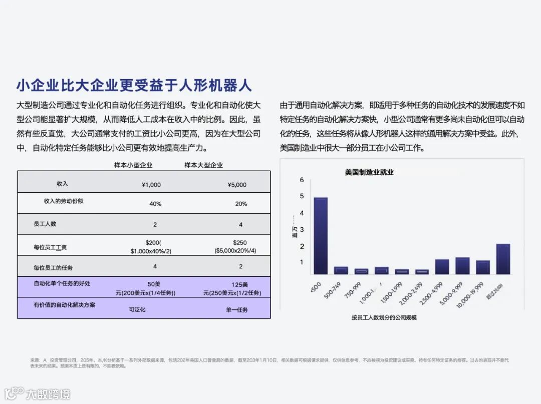 2、机器人章节,提到了人形机器人。ARK 认为人形机器人的应用关键在于通用,小企业由于自动化、专业化程度较低,将更容易受益于人形机器人提供的通用解决方案。据 ARK 测算,机器人生产力提升100%相当于替代一名工人十年全职工作。