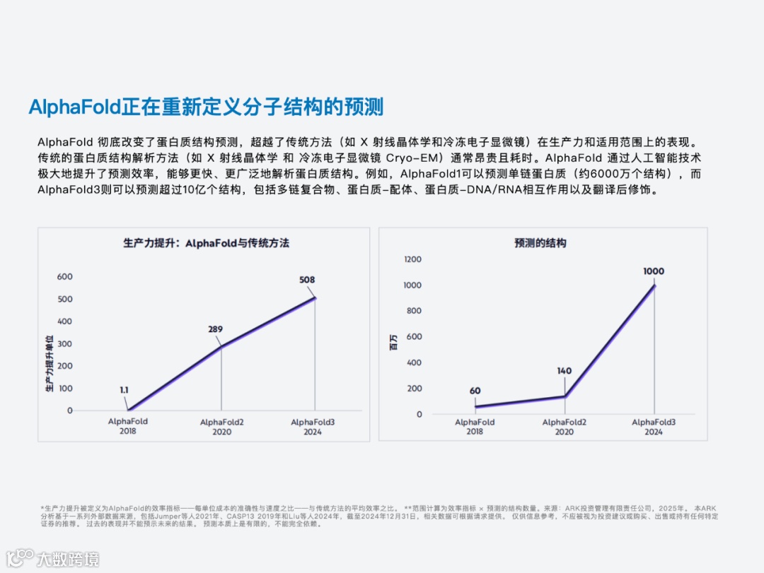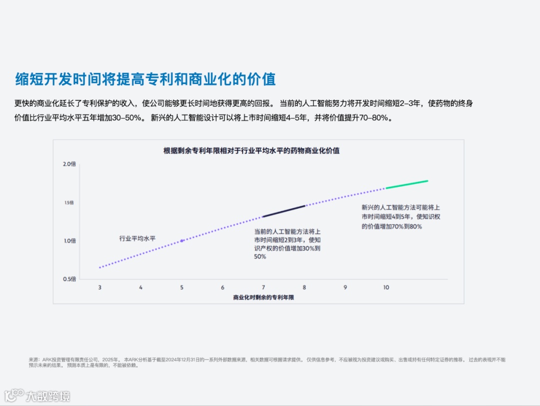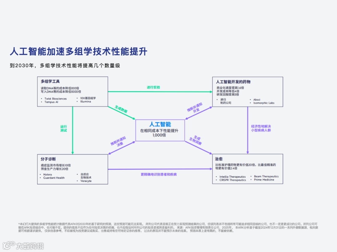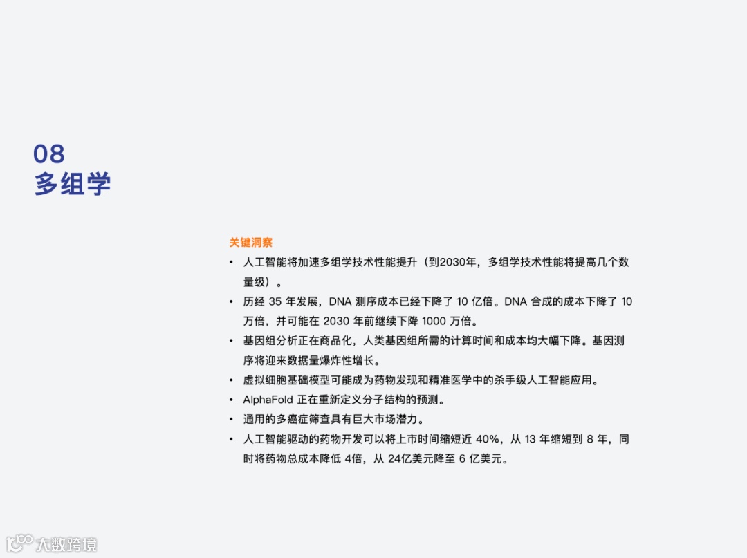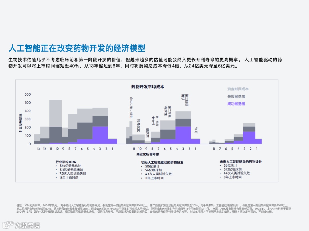 着重强调了 AI 技术的重要作用:从蛋白质结构设计、药物发现到临床试验、精准医疗,人工智能有助于显著降低成本、提高效率,有望逆转制药/生物技术行业数十年来的回报下降趋势。