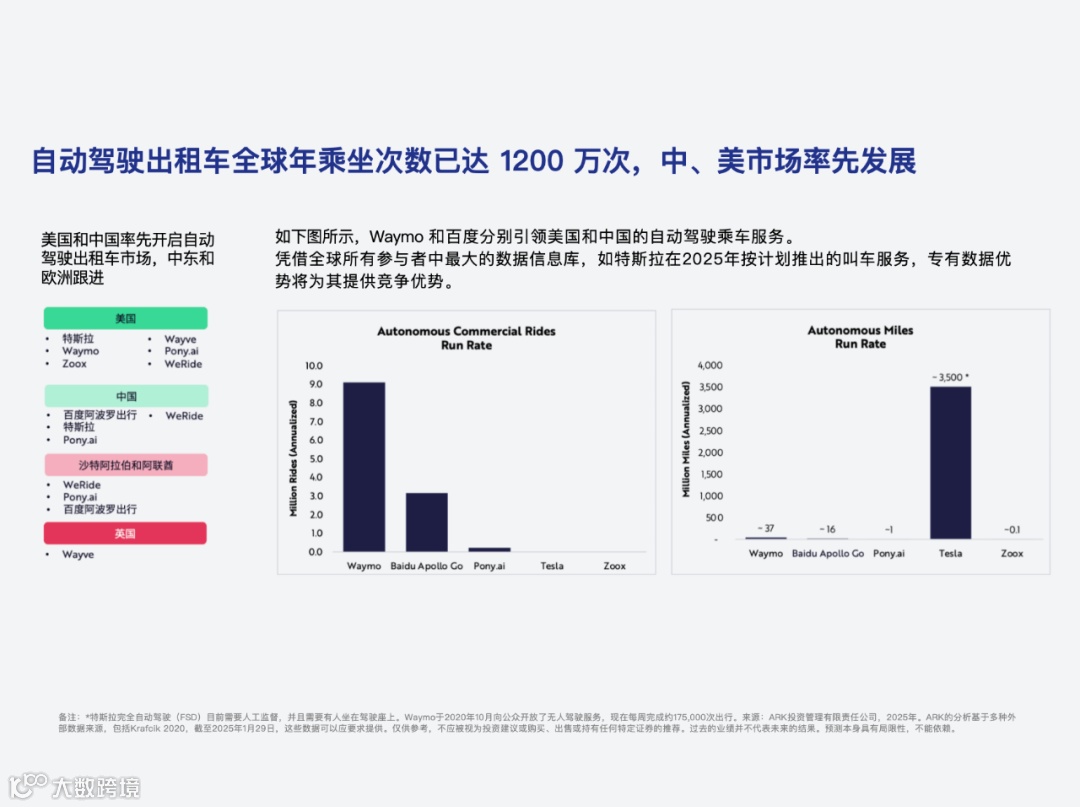 1、Robotaxi、无人物流章节对现有市场格局,及主要玩家的进展进行了简要分析,另外还强调了waymo、特斯拉在安全性上的突出表现(多了些实际数据佐证)。