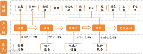 光伏主产业链包括硅料→硅片→电池片→组件。