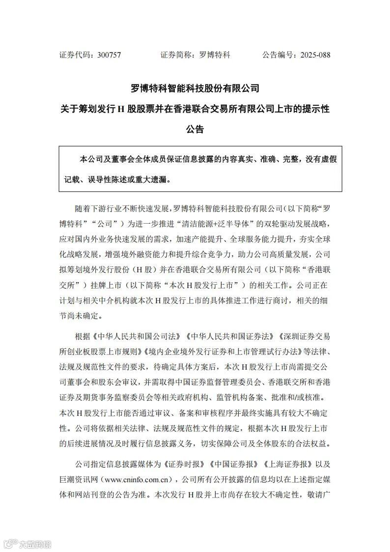 9月8日,罗博特科发布关于筹划发行H股股票并在香港联合交易所有限公司上市的提示性公告。