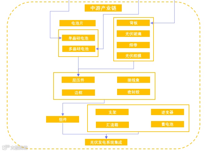 中游是技术与资金密集度最高的环节,核心任务是将硅片转化为光伏组件并完成系统集成,分为四大模块: