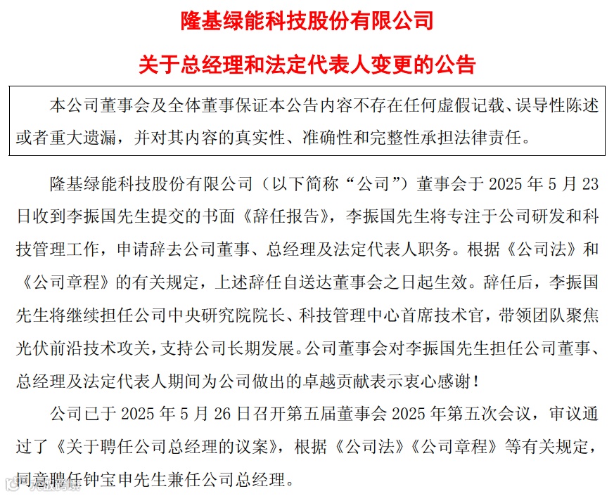 5月26日晚间,隆基绿能科技股份有限公司(以下简称“隆基绿能”)发布公告宣布高层人事调整。李振国将专注投入公司研发和科技管理工作,辞去公司董事、总经理及法定代表人职务。