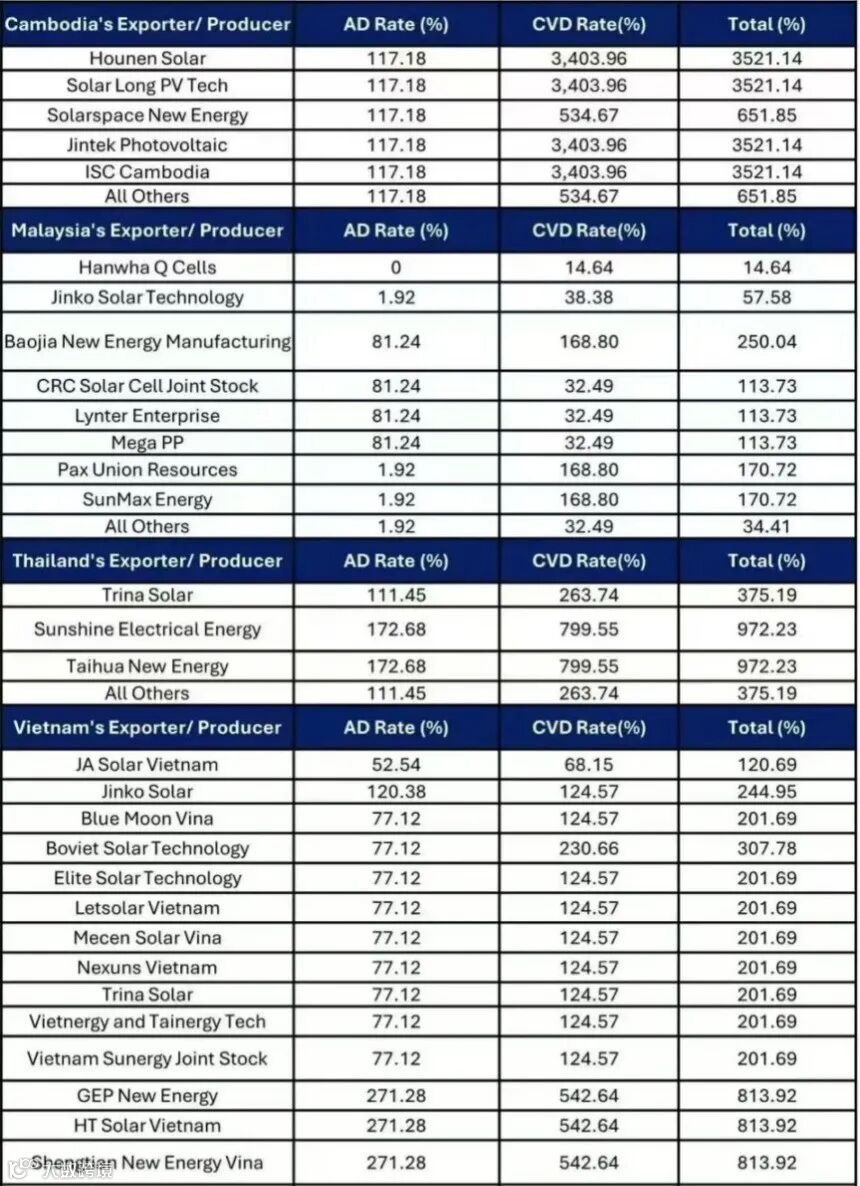 2025 年 5 月 21 日,美国国际贸易委员会(USITC)一纸裁决震动全球光伏圈 —— 认定柬埔寨、马来西亚、泰国、越南四国输美太阳能电池及组件构成 "实质性损害威胁",随即祭出惩罚性关税大棒。其中柬埔寨部分企业因拒配合调查,面临关税高达3521% ,越南、泰国平均税率超 370%,马来西亚虽 34% 相对温和,却仍让晶科等中企面临超 40% 的合并税率。这场历时一年的贸易调查,本质是美国本土产业借政策壁垒绞杀中企海外产能的关键战役。