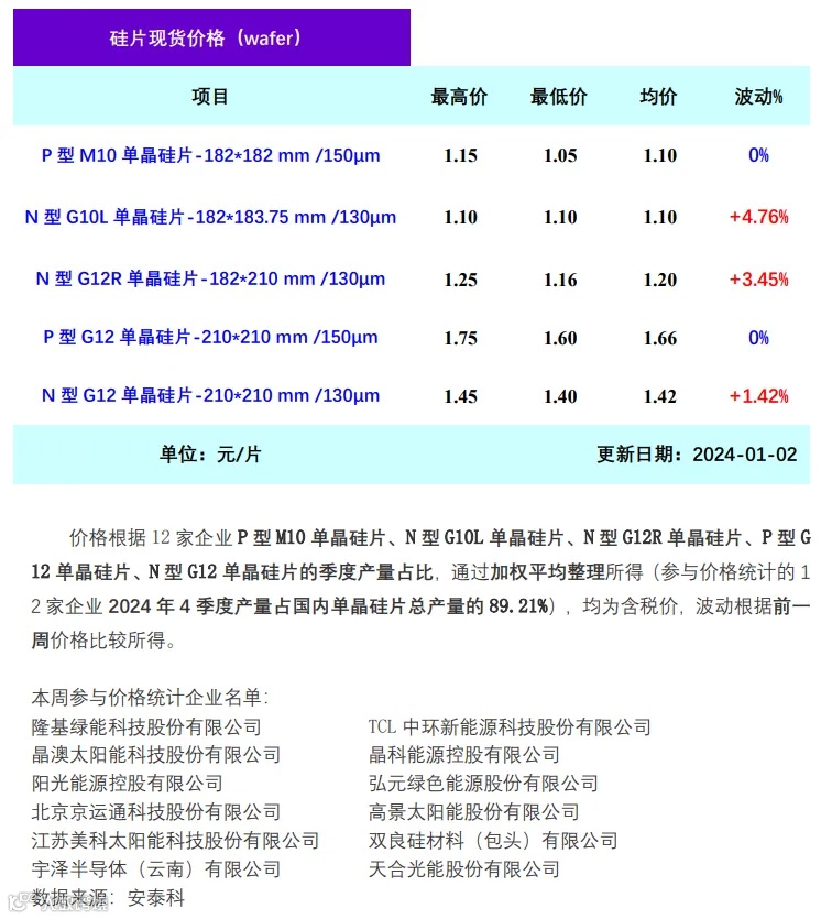 1月2日,硅业分会公布本周单晶硅片价格。上周硅片价格开启涨势,其中N型G10L单晶硅片(182*183.75mm /130μm/256mm)成交均价涨至1.1元/片,涨幅达4.76%;N型G12R单晶硅片(182*210mm/130μm)成交均价涨至1.2元/片,涨幅达3.45%;N型G12单晶硅片(210*210 mm/150μm)成交均价涨至1.42元/片,涨幅达1.42%。