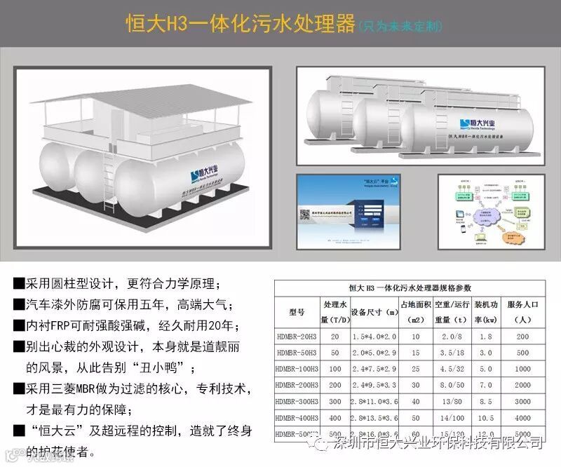深圳市恒大兴业环保科技有限公司经营理念为“环保事业,每一天,为明天!”主营产品有:恒大H3一体化污水处理器、三菱MBR膜一级代理商、工业废水零排放系统工程、津膜科技签约合作大客户,欢迎咨询王工:13713758309。