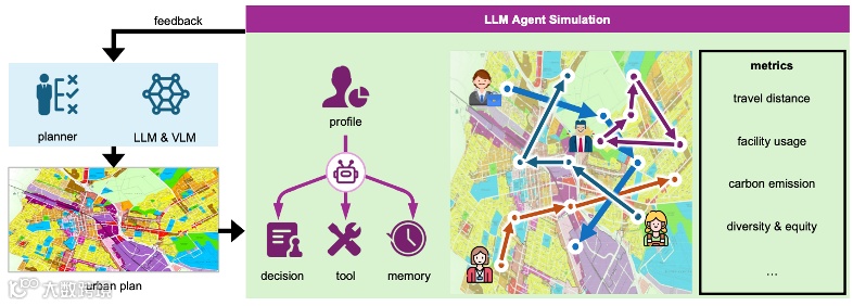 为了对规划方案进行科学评估,框架引入了LLM智能体进行城市动态模拟。研究人员为智能体设定不同的人口统计学特征(如年龄、职业),让它们在生成的虚拟城市中模拟居民的日常出行、设施使用等活动。通过分析这些模拟行为,可以得到关于交通距离、设施使用率、碳排放、社会公平性等多维度的量化评估指标,为规划方案的迭代优化提供科学、前瞻性的反馈。