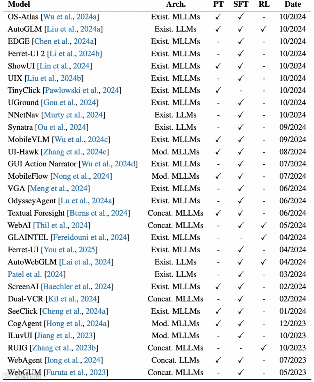 图|OS Agents 基础模型。Arch:架构,Exist:现有,Mod:修改,Concat:拼接,PT:预训练,SFT:监督微调,RL:强化学习