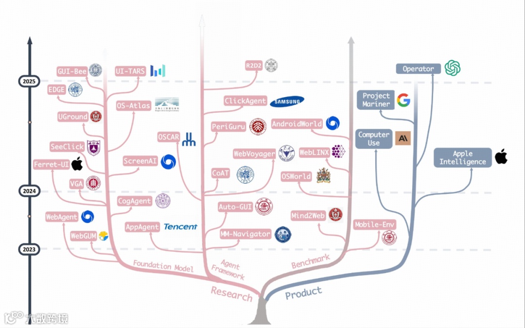 图|OS Agents 领域在近些年的发展进程,包括基础模型、Agent 框架、基准测试和产品等。
