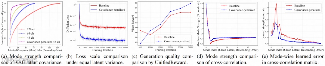 - 谱特性分析与正则化:我们通过大量实验发现,具有时空低频偏置(Low-Frequency Bias)和通道特征值的少模式偏置(Few-Mode Bias)的隐空间分布,能显著加速扩散模型的训练。