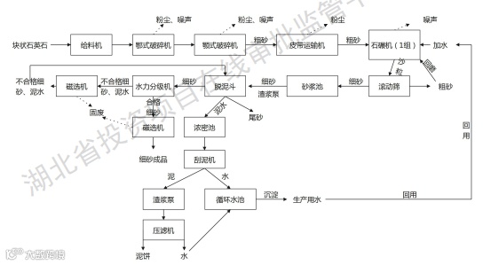 环评信息显示,拟建项目所用石英砂从宜昌市九元科技有限公司购买;该项目计划新建加工生产线一条、厂房2个,购置石英砂主要生产设备包括2台颚式破碎机、1台给料机、1台皮带运输机、12台石英石碾压机、4台水力分级机、2台磁选机等,配套完善地磅、供电、道路等基础设施。。