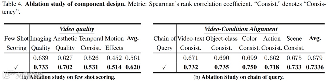 链式查询使视频-条件对齐评估提升了 9.3%,少样本评分将成像质量评估相关性从 46.1%(单样本)提升至 62.4%(7 样本)。组合使用两项技术时,评估稳定性(TARA@3)达67%,Krippendorff's α 达 0.867,验证了这些组件设计的有效性。