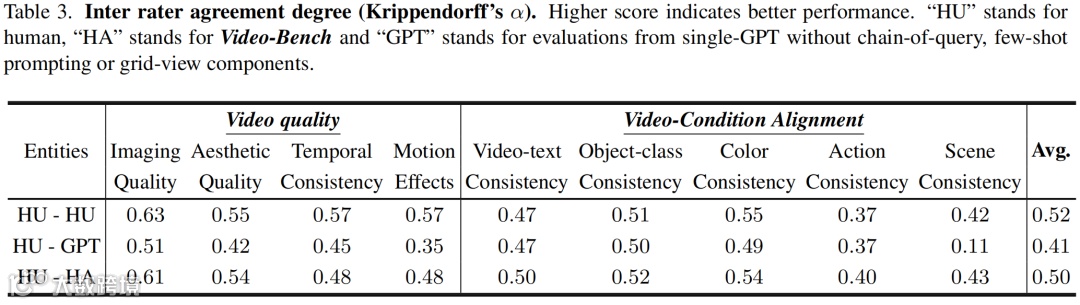 为验证评估结果的可靠性,研究团队组织了 10 人专家小组对 35196 个视频样本进行标注。评估者间一致性(Krippendorff's α)达 0.52,与人类自评水平相当。