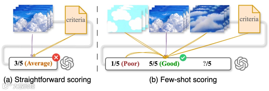 (2)少样本评分技术:如图 3 (b) 所示,模仿人类横向比较的本能,通过同时对比多个同主题视频,使抽象的美学评价变得可量化。例如在评估"电影感"时,系统会横向比较不同生成结果的运镜流畅度、光影层次感,而非孤立打分。