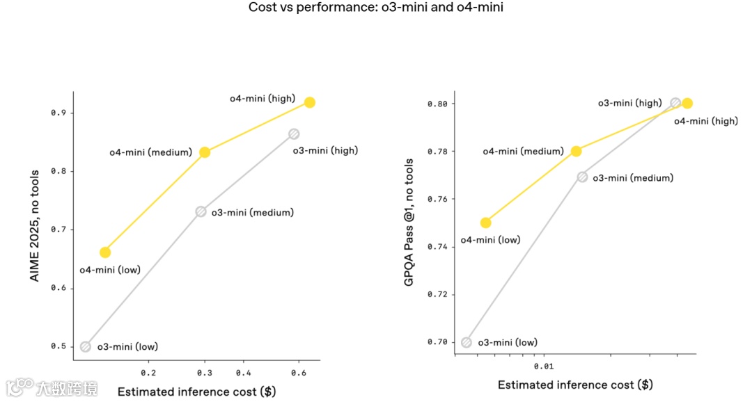 例如,在 2025 年 AIME 数学竞赛中,o3 的性价比边界比 o1 有显著提升;同样,o4-mini 的性价比边界也比 o3-mini 有显著提升。