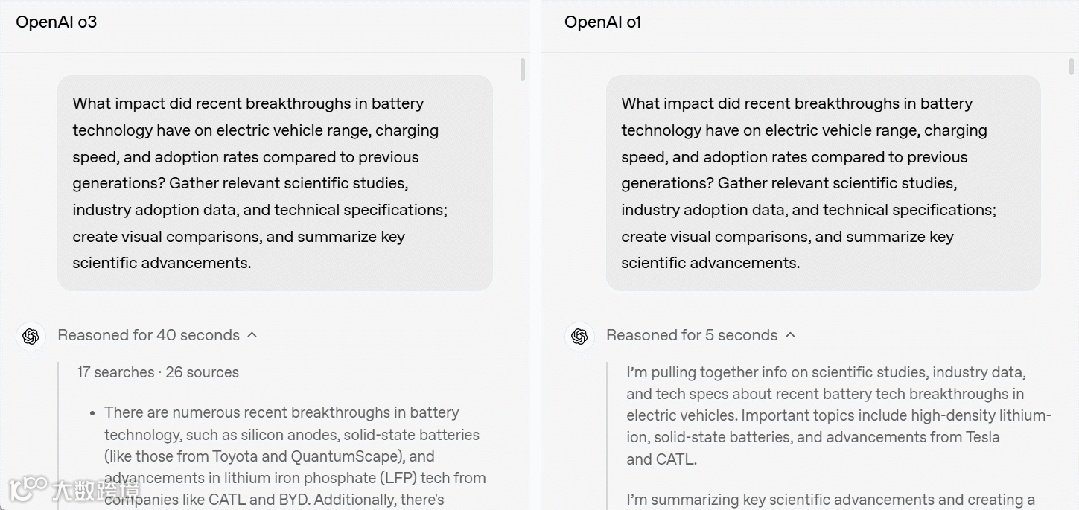 再比如在科学问答任务中,o3 提供了全面、准确且富有洞察力的分析,分析了最近的电池技术突破如何延长电动汽车续航里程、加快充电速度并推动采用,所有这些都有科学研究和行业数据作为支持。o1 虽然可信且切题,但不够详细和具有前瞻性,存在一些小错误或过于简单化。