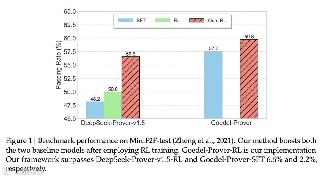 通过持续训练和强化学习过程,他们成功改进了现有的形式化证明器,包括 DeepSeek-Prover-v1.5 和 Goedel-Prover,在 whole-proof 生成领域取得了 SOTA。例如,他们在 MiniF2F 上实现了 59.8% 的通过率(pass@32)。