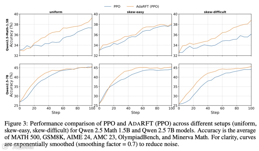 在竞赛级数学数据集(包括 AMC、AIME 和 IMO 类型的问题)上进行的实验证明,AdaRFT 提高了训练效率和推理性能。他们评估了 AdaRFT 的多种数据分布和模型大小,结果表明它减少了 2 倍的训练步骤,并提高了准确性,提供了一个更具可扩展性和更有效的 RFT 框架。