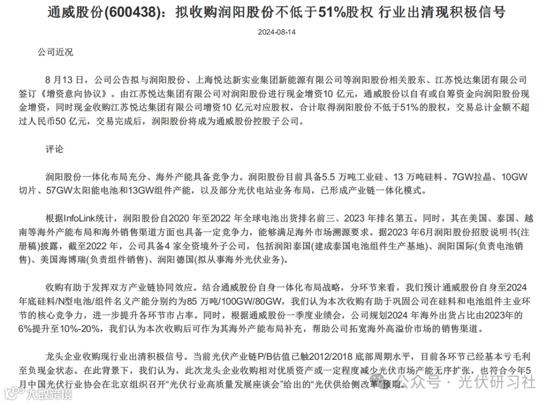 最新消息,通威股份拟向润阳股份增资并取得其控股权。