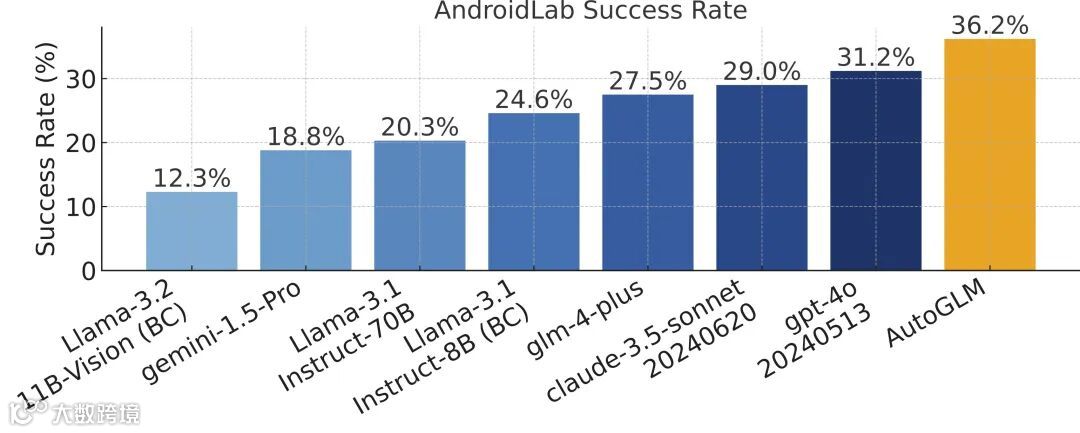 通过综合应用智谱自研的「基础智能体解耦合中间界面」和「自进化在线课程强化学习框架」策略,AutoGLM 在 Phone Use 和 Web Browser Use 上都取得了大幅的性能提升。例如,在 AndroidLab 评测基准上,AutoGLM 就显著超越了 GPT-4o 和 Claude-3.5-Sonnet 的表现。