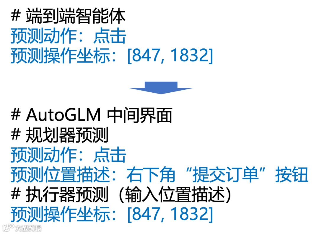 为了解决这一问题,AutoGLM 引入了「基础智能体解耦合中间界面」设计,将“任务规划”与“动作执行”两个阶段通过自然语言中间界面进行解耦合,实现了智能体能力的极大提升。例如,在手机上点外卖,需要点击“提交订单”按钮时,对比传统和“中间界面”方案如下: