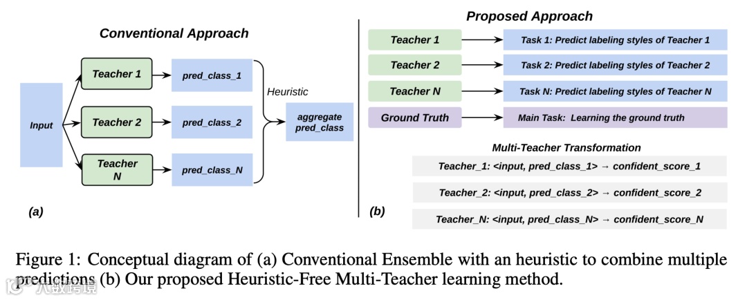 谷歌团队提出了 Teacher2Task,这是一种多教师学习框架,无需人工汇总启发式方法。现有的多教师方法通常依赖于这种启发式方法组合来自多个教师的预测,这往往会导致次优的聚合标签和聚合误差的传播。Teacher2Task 通过引入特定教师的输入 token 和重新制定训练流程,解决了这些局限性。