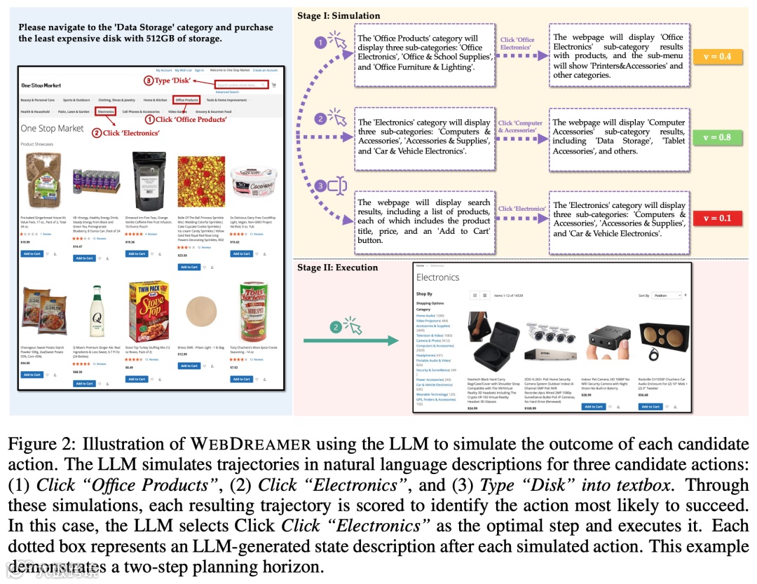 在这项工作中,来自俄亥俄州立大学和 Orby AI 的研究团队提出了一种新颖的范例,它通过基于模型的规划来增强语言智能体,开创性地将大语言模型(LLM)作为复杂网络环境中的世界模型。这一方法为 WebDreamer,建立在 LLM 本身编码有关网站结构和功能的全面知识这一关键见解之上。具体来说,WebDreamer 利用 LLM,使用自然语言描述模拟每个候选操作的结果(例如,“如果我点击这个按钮会发生什么?),然后对这些想象的结果进行评估,以确定每一步的最佳行动。