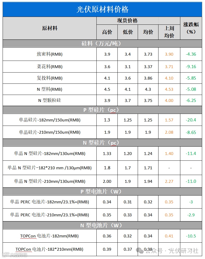 本周多晶硅价格持续下滑,N型价格较为一致,P型价格混乱。