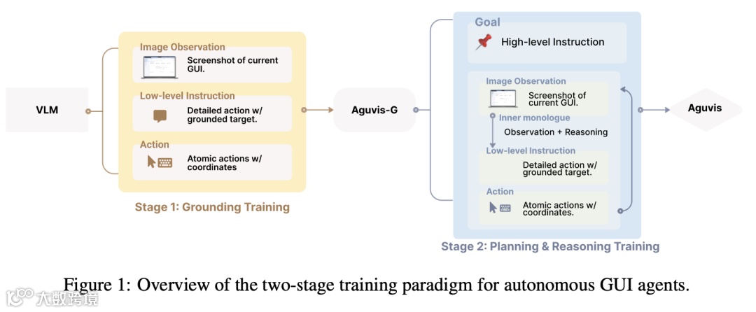 在这项工作中,香港大学和 Salesforce 研究团队提出了一个可在各种平台上运行的基于纯视觉的统一自主 GUI agent 框架——Aguvis。这一方法利用了基于图像的观察和自然语言对视觉元素的基础指令,并采用了一致的行动空间来确保跨平台通用性。为了解决以往工作的局限性,他们在模型中集成了明确的规划和推理功能,增强了其自主导航和与复杂数字环境交互的能力。他们构建了一个大规模的 GUI agent 轨迹数据集,整合了多模态推理和接地(grounding),并采用了两阶段训练管道,首先侧重于一般的 GUI 接地,然后是规划和推理。