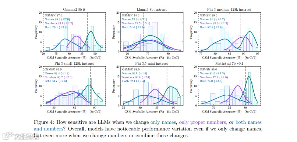 图|由 GSM-Symbolic 模板生成的 50 套 8-shot 思想链(CoT)性能分布,显示了所有 SOTA 模型之间准确性的显著差异性。