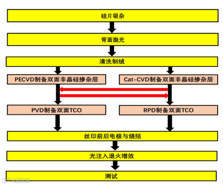 这种方法的变化在于(1)利用P型单晶硅衬底作为P区,正背面均无需硼掺杂,且无 需掩膜和光刻,工艺步骤简单;(2)P区正电极采用Al浆,Ag浆使用量降低50%,且采用P 型单晶硅作为基底,明显降低了生产成本。激光设备在此方法下得到比较好的应用。