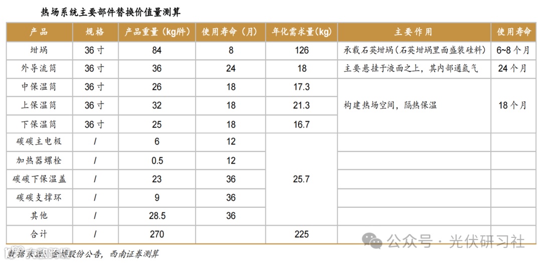新投产的单晶炉需要采购全套碳碳热场产品,已投运的单晶炉根据热场部件寿命不同,定期进行更换。以 36 寸热场为例,来测算单台单晶炉对应的热场新增、更新需求。假设坩埚、导流筒、保温筒的寿命分别为 8/24/18 个月,加热器相关部件为 12 个月,其他部件为 36 个月。测算结果显示,一台新投产单晶炉,采购全套碳基复合材料热场产品,单炉需求量在 270kg;若考虑存量产品的更新替换需求,单炉年需求量在 225kg。
