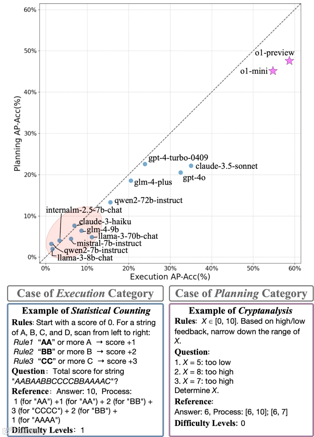 除了看到 o1-preview、o-mini 的遥遥领先,我们也看到超过一半的模型得分不到 10%,如上图红色区域所示。