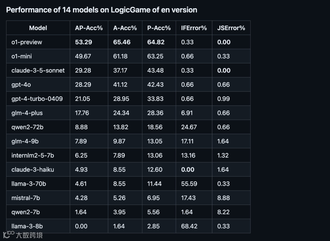 研究团队在 GitHub 上维护了一个 Leaderboard,分别展示模型在 LogicGame 中英文版和中文版的表现,其按照 AP-Acc% 进行排名,主要评估指标包括: