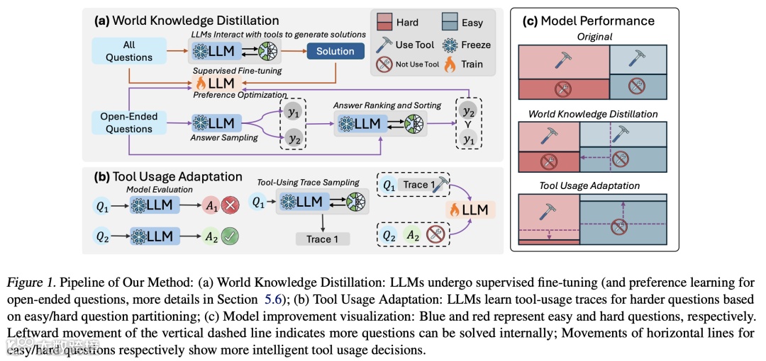 受人类解决问题过程的启发,来自清华大学和加州大学的研究团队提出了一种由两部分组成的新型微调方法。在“世界知识蒸馏”(WKD)中,LLM 直接从使用工具信息生成的解决方案中学习,从而内化领域知识。在“工具使用适应”(TUA)中,他们根据模型的直接回答准确率,将问题分为简单和困难两类。