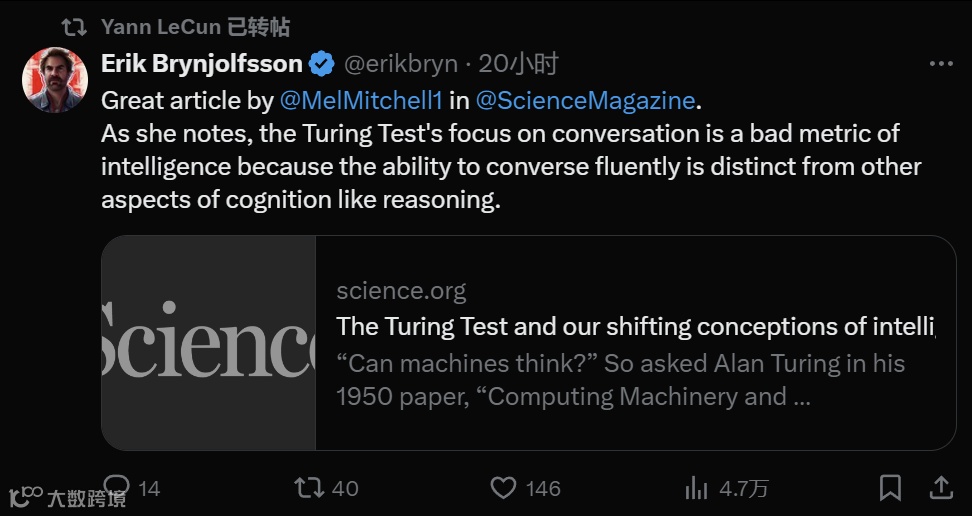 「图灵测试是一个糟糕的测试标准,因为对话能力和推理完全是两码事。」最近几天,AI 圈里一个新的观点正在流行。