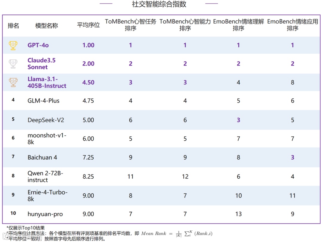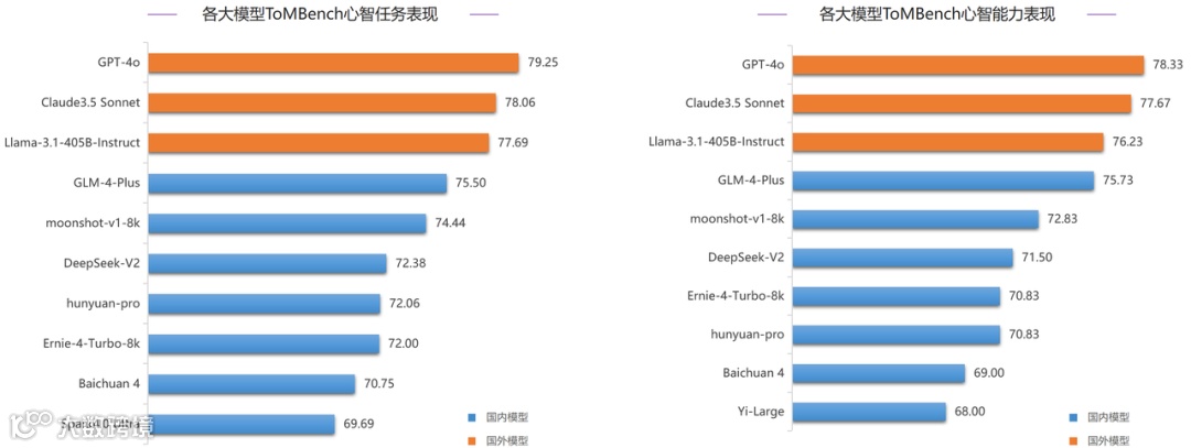 心智任务:GPT-4o以79.25分领跑,领先排名国内第一的GLM-4-Plus3.75分,moonshot-v1-8k排名国内第二,得74.44分;国内其他模型中,DeepSeek-V2、hunyuan-pro、Ernie-4-Turbo-8k分数接近,均在72分档。