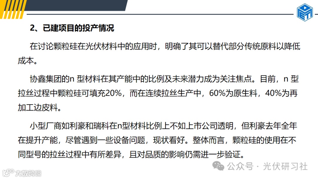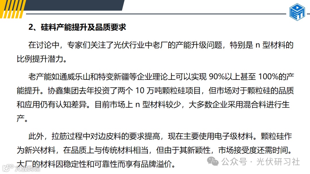 此外,早期投立的企业如利好、润扬以及宏源团队凭借经验,有望提高产量和品质。在技术层面,n 型单晶行业的技术人员需要考虑使用边皮料来生产 n 型硅料,即便是 p 型硅料也可以应用于生产过程中,保证了材料的灵活性和生产的连续性。