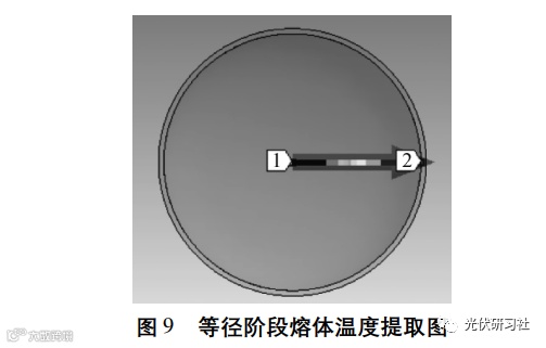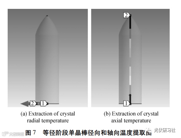在等径长度为60cm时,对改进前、后单晶炉的晶棒和熔体进行温度提取。图7为等径阶段硅晶体轴向和径向温度提取位置图,