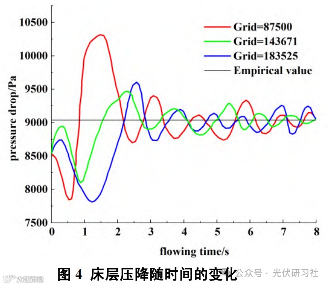网格质量是影响模拟计算结果准确与否的主要因素。判定计算结果是否准确的最直观参数则是流化床的压降。本论文对物理模型一划分网格数87500、143671、183525对网格的敏感性进行讨论,研究在不同网格数下流化床压降的变化。经计算得到的理论床层压降∆P约为9037Pa,再将数值模拟的瞬时压降与理论值进行对比。如图4所示,在不同网格数下,床层的瞬时压降都在理论值上下浮动,且随着模拟