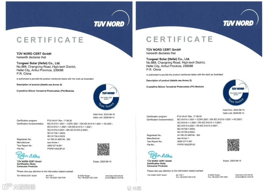 通威股份微信公众号9月16日发布消息称,9月15日,通威股份旗下通威太阳能获全球权威第三方检测认证机构TÜV北德集团(简称“TÜV北德”)颁发的全球首张IEC 61215:2021/IEC 61730:2023组件认证证书。