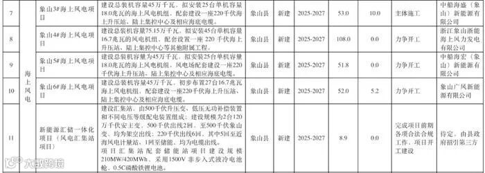 象山6#海上风电项目:建设总装机容量45万千瓦,初步布置27台16.7兆瓦海上风电机组,配套建设一座220千伏海上升压站、陆上集控中心及相应海底电缆。项目总投资52亿元,项目单位为象山广风新能源有限公司。
