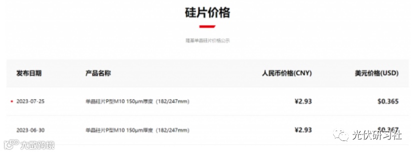 7月25日,隆基绿能发布单晶硅片最新价格。p型M10(182mm)硅片价格与6月30日报价一致,仍为2.93元/片,并未调整。