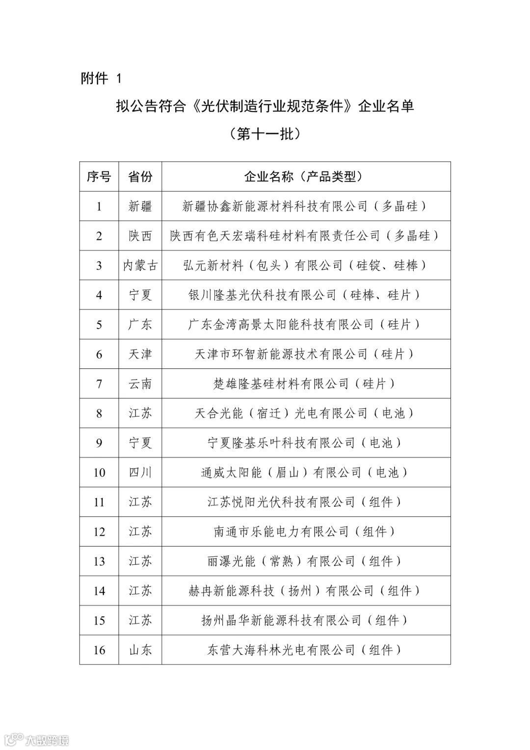 拟公告符合《光伏制造行业规范条件》企业名单(第十一批)和拟撤销光伏制造行业规范公告企业名单(第六批)公示