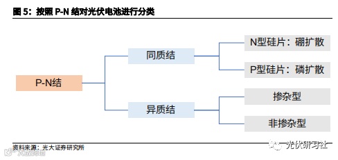 P-N 结是光伏电池的“心脏”。按照 P-N 结类型,光伏电池可以分为同质结电池和异质结电池。其中同质结电池主要通过扩散的方式,在同一种类型的硅片(P 型或 N 型)上实现掺杂,从而得到 P-N 结。异质结电池的 P 型区和 N 型区由不同类型的半导体材料构成,可分为掺杂型和非掺杂型。