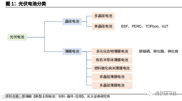 晶硅电池的提效降本是光伏行业发展的关键,规模化、技术进步、成本降低三者互相促进。从最初规模化量产的铝背场电池,到 PERC(发射极钝化和背面接触),再到 HJT(本征非晶层的异质结)电池和 TOPCon(隧穿氧化层钝化接触电池),以及未来的叠层电池,光伏电池效率不断逼近极限,并由此带来成本与规模的突破。